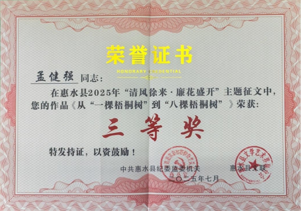 近日,由我校党内法规与廉政建设研究中心研究员孟健强报送的《水鉴:一组流动的廉洁史诗》《从”一棵梧桐树“到”八棵梧桐树“》两篇文章,参加两项全国廉洁文化征文活动,分别荣获二等奖、三等奖。